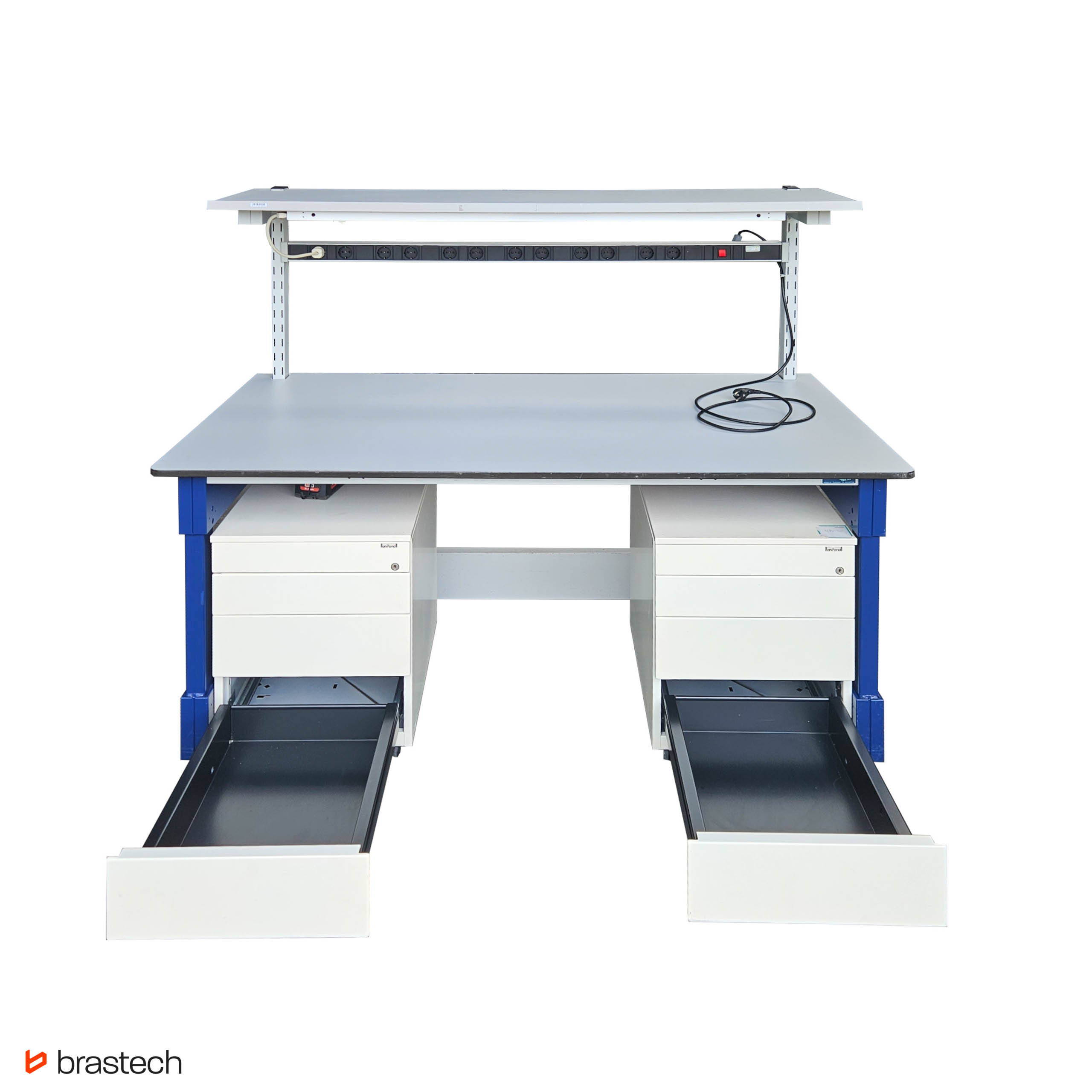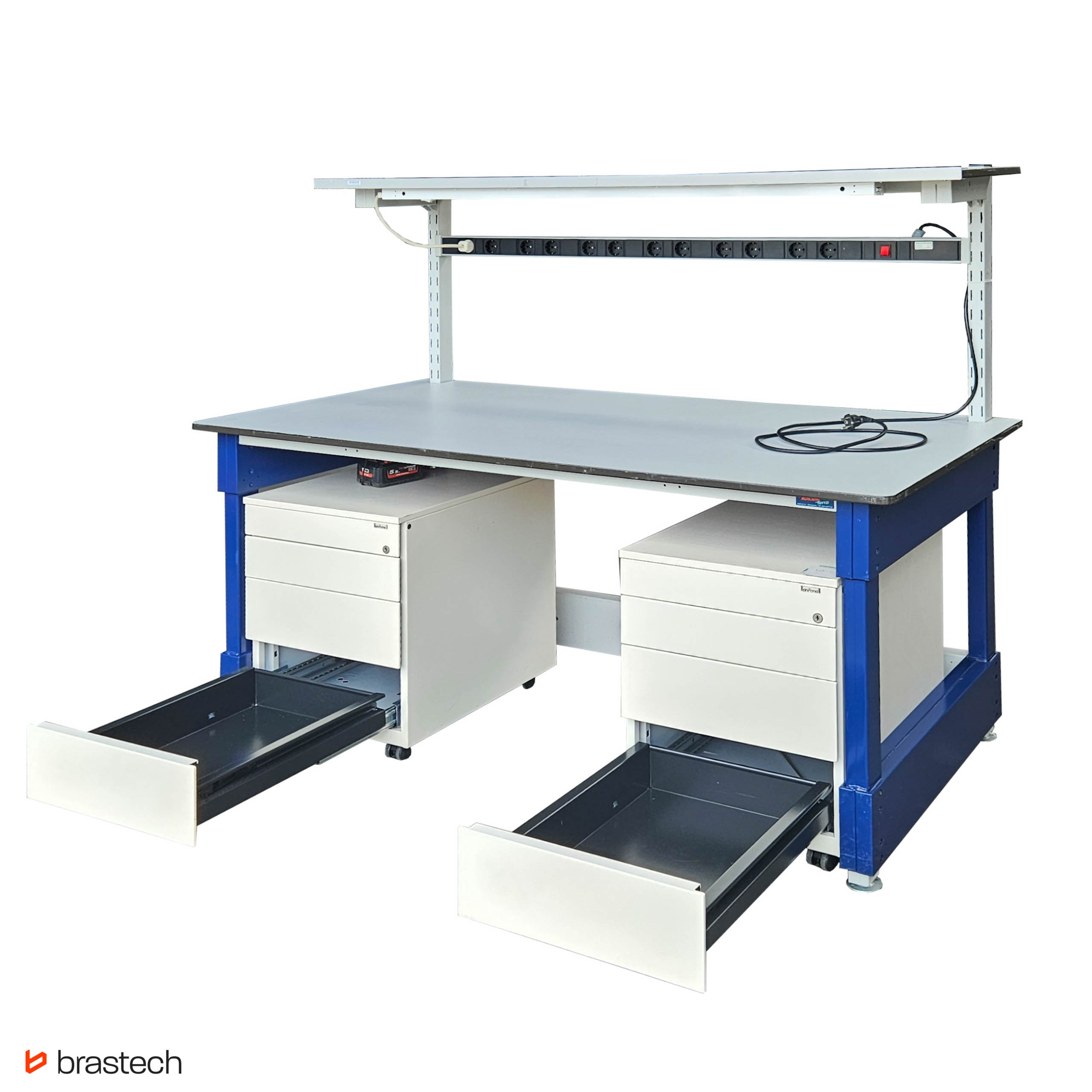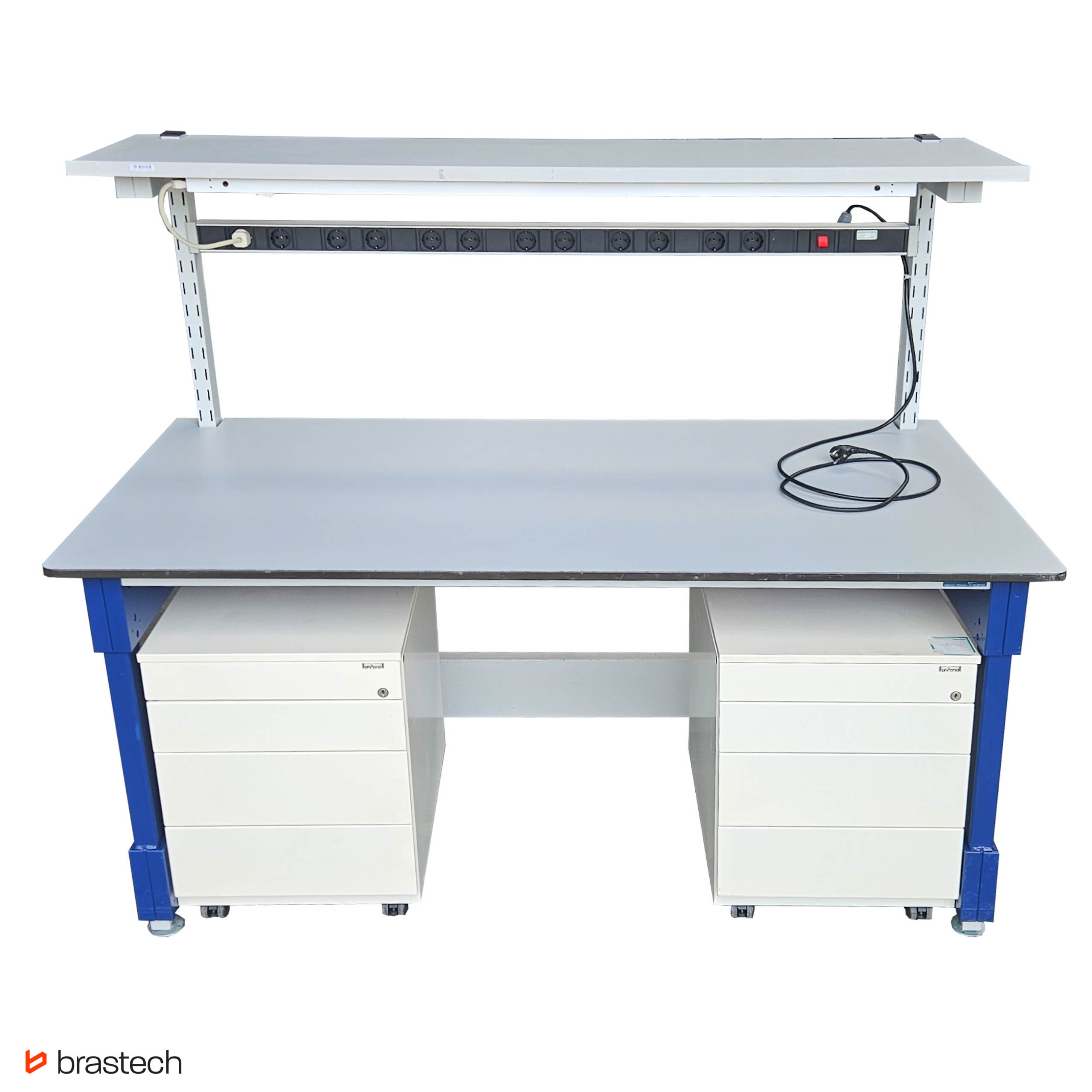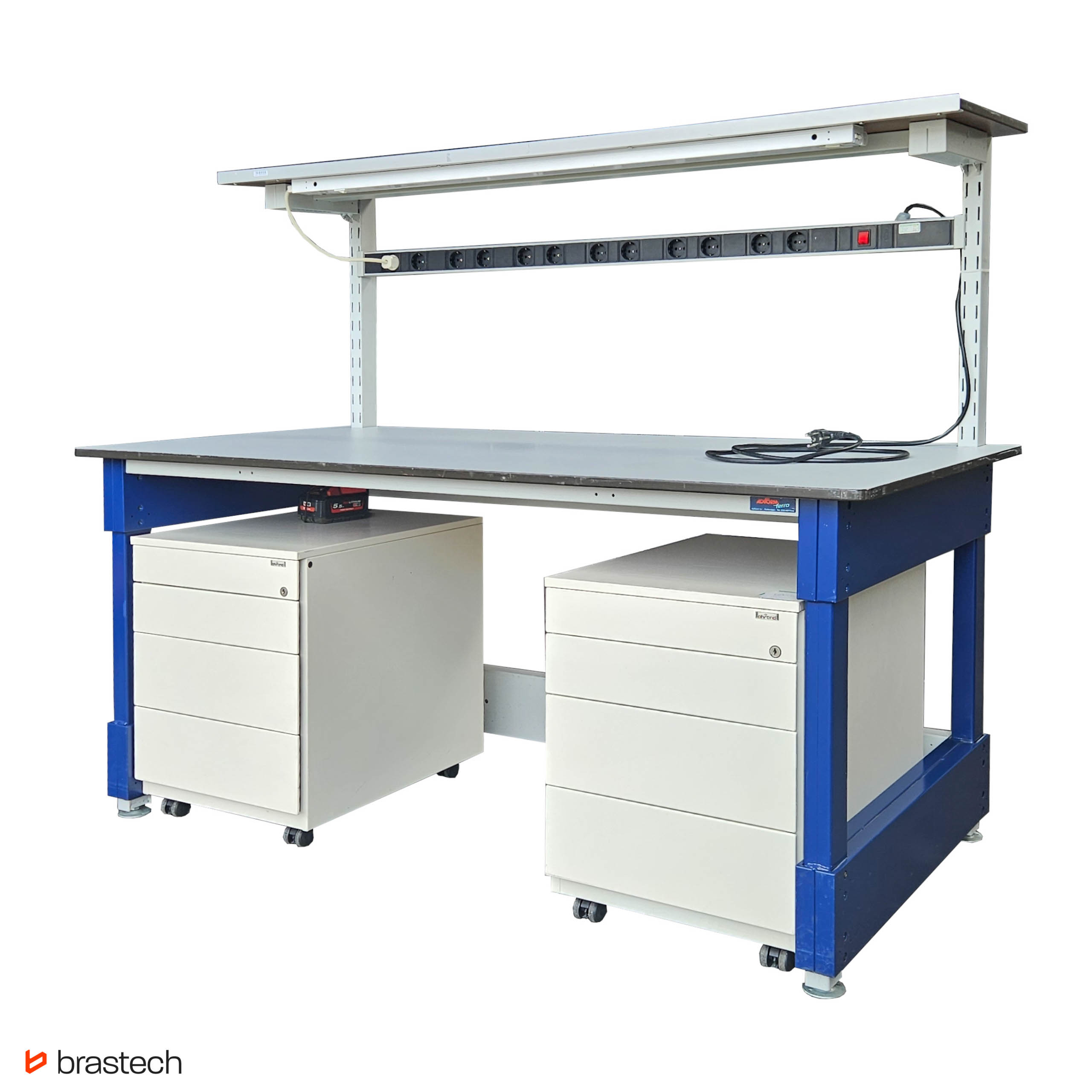 | Uwagi | Stoły techniczne z listwą zasilającą oraz całą instalacją oświetleniową. Brak świetlówki w komplecie. Dodatkowo dwa mobilne kontenery z organizerem i szufladami |