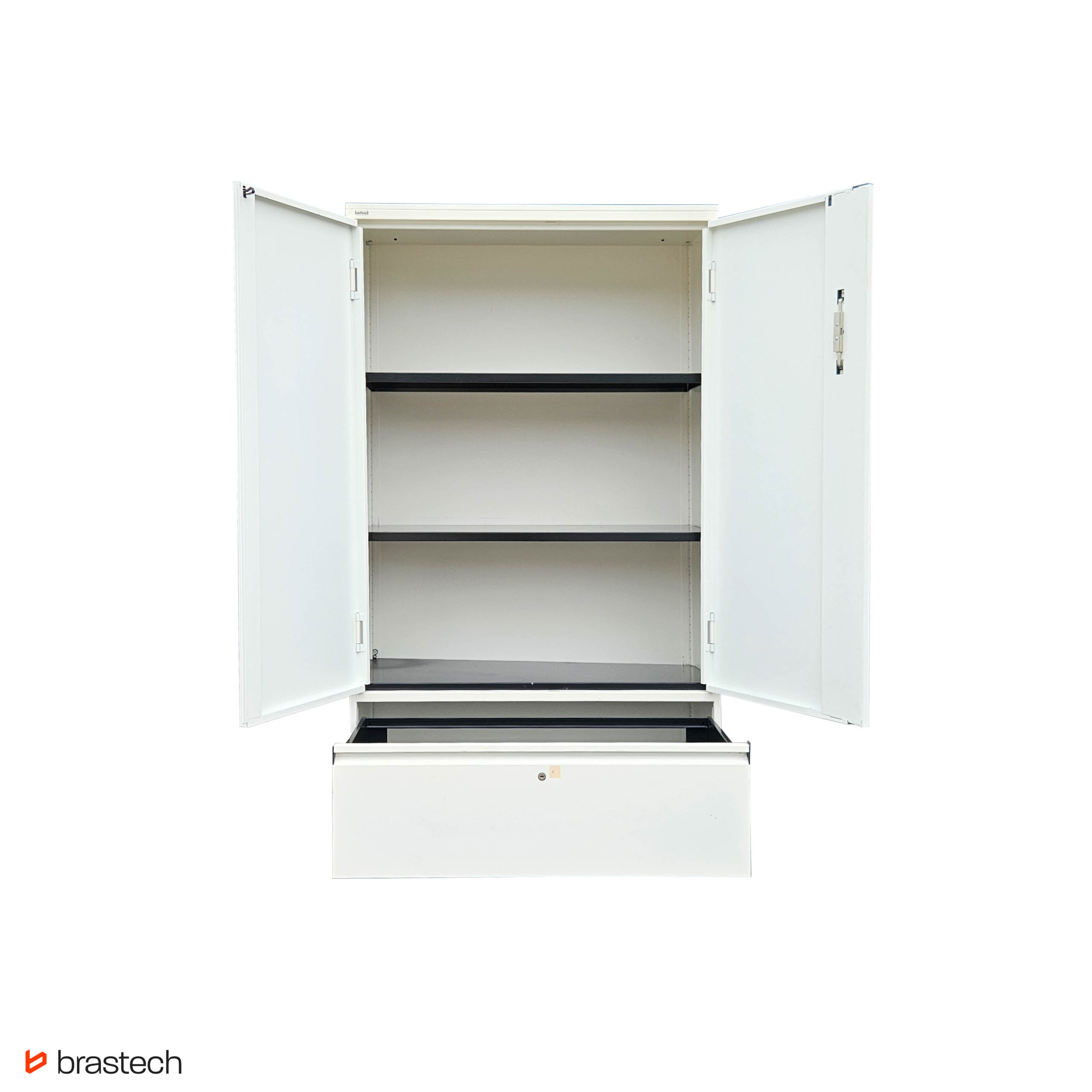 Dwuskrzydłowe drzwi z uchwytem i zamkiem – klasyczne otwieranie na zawiasach zapewnia pełny dostęp do wnętrza szafy. Drzwi opcjonalnie mogą być wyposażone są w zamek z kluczem, który chroni zawartość przed dostępem osób nieuprawnionych.